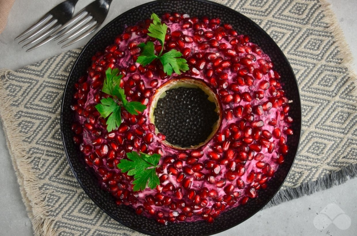 Вулкан гранатовых зерен в центр и немного рассыпаем сверху.