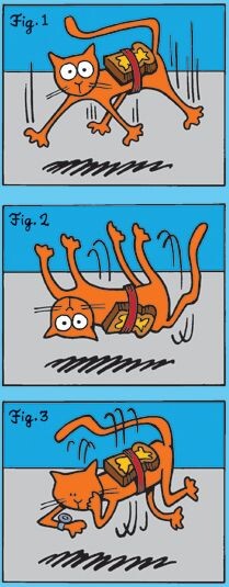 — Кошка, сброшенная в перевёрнутом положении без начального момента импульса, достигает ориентации «лапами вниз» за конечное время \( \tau_c \).