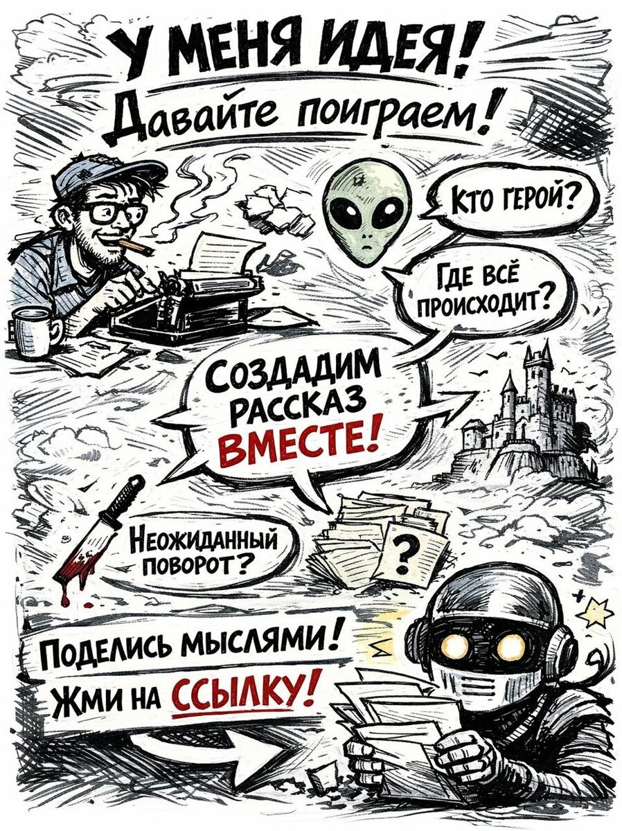 Давайте поиграем Я сегодня подумал, ведь в каждом из нас сидит творческий гений, который никогда не видел света или давно уже не выходил наружу. Так и чего бы не сделать это вместе? Хочу собрать из вас — из ваших голов, фантазий, страхов, надежд и странных мыслей в три часа ночи — один общий рассказ. Как это работает: я сделал форму с 15 вопросами - https://forms.yandex.ru/u/694b72381f1eb5ad516a91a8. Ни один вопрос не обязательный! Заполняешь только то, куда мысль сама идёт. Хочешь придумать только название? Ок. Хочешь описать мир, где всё происходит? Давай. Хочешь вбросить фразу, которую герой точно скажет? Вперёд. Чтобы было понятно — вот как это выглядит на примерах: Вопрос: "Кто главный герой?" — Валико Мизандари, пилот вертолёта. Гордый, вспыльчивый, наивный. Хочет летать на больших самолётах — потому что это "серьёзно" (это "Мимино") — Кевин Ломакс, адвокат из Флориды. Ни одного проигранного дела. Хочет большего — большие деньги, большие клиенты, большое имя (это "Адвокат