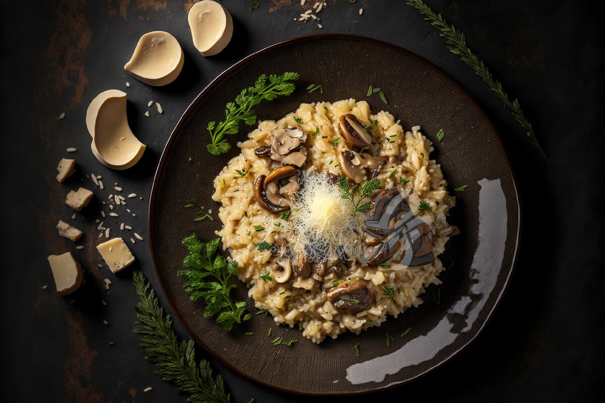 Этот процесс займет около 18-20 минут. Рис должен быть аль денте – с легким сопротивлением при укусе. - Завершение блюда:Снимите сковороду с огня. Добавьте сливочное масло, тертый Пармезан и трюфельное масло. Хорошо перемешайте до получения однородной кремовой консистенции. Попробуйте на вкус и при необходимости добавьте соль и перец.