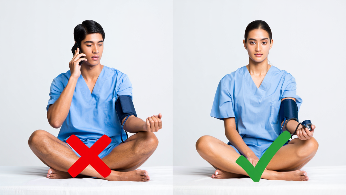 Как вы сидите во время измерения? Скрещивание ног в коленях или лодыжках — это ошибка, которая моментально повышает систолическое давление на 5-8 единиц из-за сдавливания крупных вен. Также важно иметь опору под спиной. Если вы сидите на табурете без спинки, мышцы спины напрягаются, что также искажает результат. Идеальная поза — это кресло или стул со спинкой, стопы плотно прижаты к полу, рука на столе.
