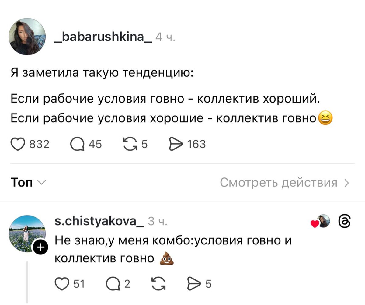 «Если рабочие условия плохие — коллектив хороший. Если рабочие условия хорошие — коллектив плохой».