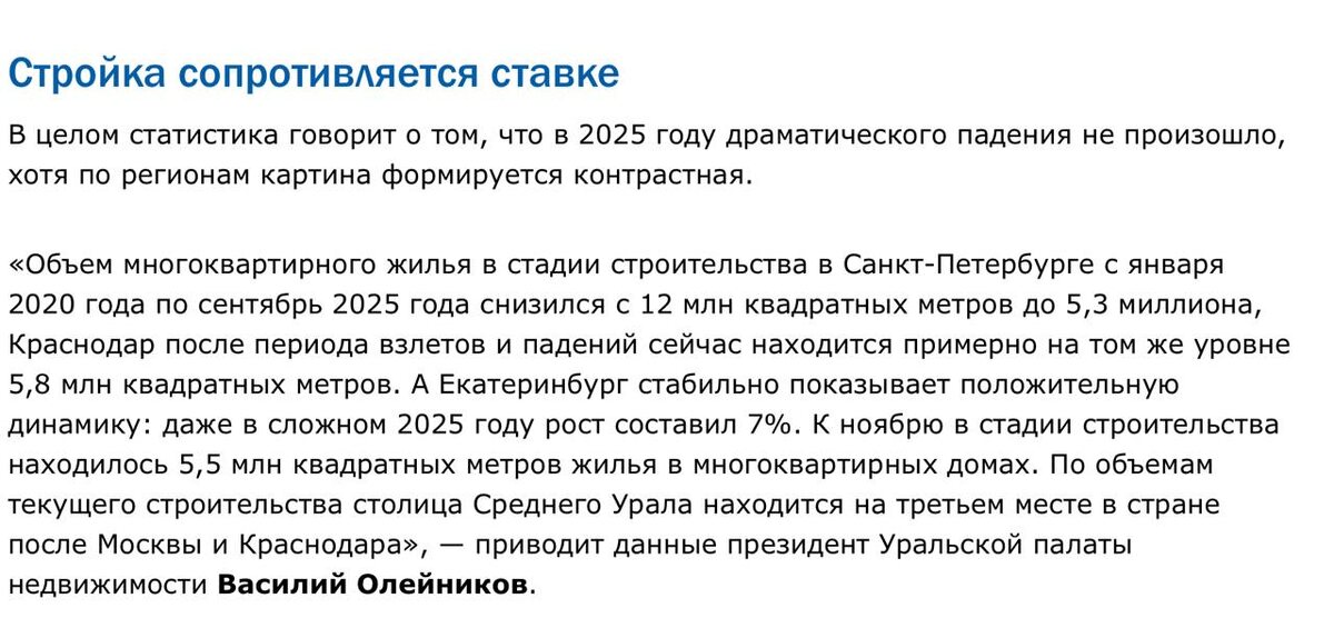 находится более 63 тыс. квартир, из них около 3 тыс. сданы в эксплуатацию. При этом сохраняются резервы для ротации и увеличения предложения». «В прошлом году количество сделок по ДДУ снизилось на 30%, в третьем квартале 2025 года — на 20% к аналогичному периоду 2024 года. Влияние кризиса видно и по показателям нереализованных квартир: было время, когда среднемесячный темп реализации строящихся квартир относительно остатков приближался к нулю, а сейчас составляет 3%», — приводит данные президент УПН. Стоимостные характеристики, по его словам, принципиально не меняются, цены предложения медленно растут. «За этот год цены на первичном рынке Екатеринбурга выросли на 9%, на вторичном — на 7%. Застройщики активно применяют скидки, причем реальных скидок стало больше. Именно акционные предложения часто обеспечивают хорошие продажи», — акцентирует Василий Олейников. При этом уровень активности покупателей на первичном рынке заметно выше вторичного. По мнению Василия Олейникова, в основном