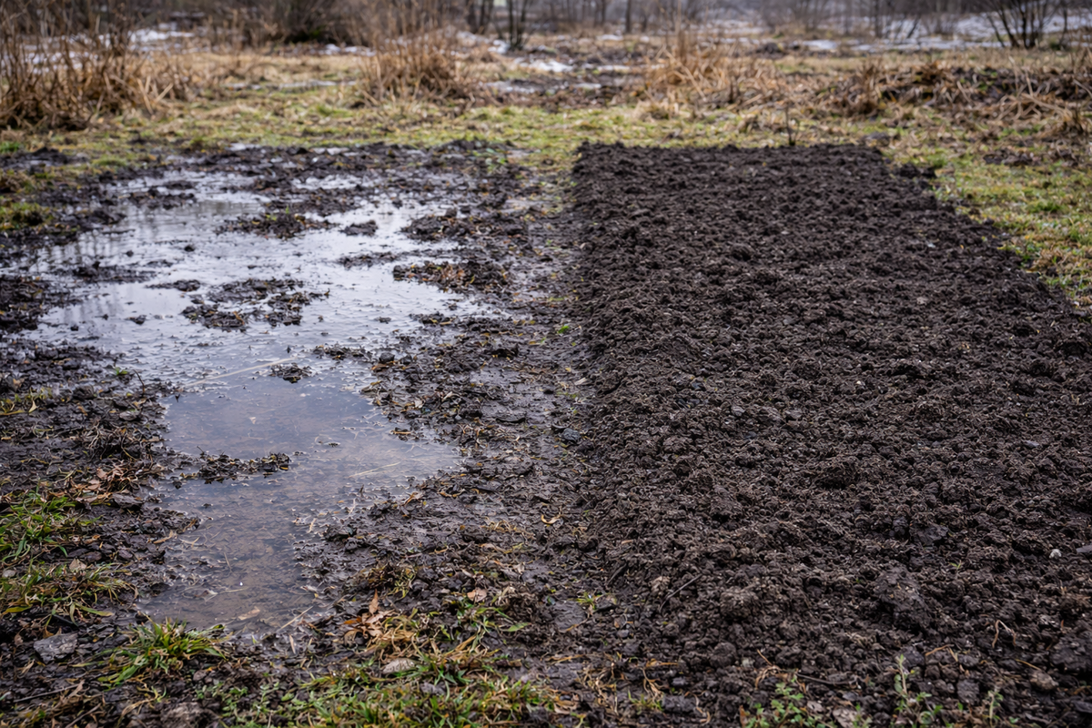 Каждую весну картина повторяется: на одном участке уже можно рыхлить землю и сеять, а в нескольких метрах — вода стоит лужами, почва липкая и холодная. При этом снег таял одинаково, дожди шли те же самые, и участок вроде бы один и тот же. Причина почти никогда не в «невезении». Разница между сухими грядками и болотцем складывается из факторов, которые накапливаются годами — и чаще всего мы сами их создаём. Главное отличие сухой весенней грядки от сырой — не количество воды, а то, куда она уходит. На рыхлой, структурной почве: На уплотнённой земле: Именно структура, а не тип почвы, чаще всего решает исход. Грядки становятся «болотцем» не из-за воды, а из-за отсутствия воздуха. Причины уплотнения: Такая почва работает как миска — принимает воду, но не отдаёт её. Сухие весной грядки почти всегда богаты органикой — компостом, перегноем, растительными остатками. Органика: На бедной или «стерильной» земле вода либо стоит лужами, либо быстро превращает поверхность в липкую кашу. Многие удивля