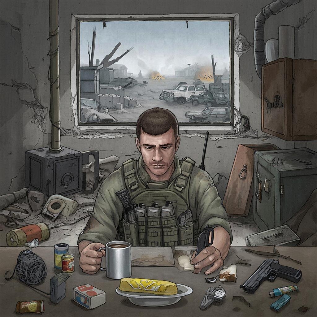 Сидя на импровизированной кухне в уцелевшем помещении полуразрушенного здания, я откусывал первый кусок батончика. С лимонным вкусом – жёсткий, как сухарь или строгая молитва. Зернистая, плотная текстура требовала усилия челюстей. Это был не перекус, а работа. С каждым медленным жеванием мир вокруг терял свою расплывчатую, пугающую остроту. Слух, забитый чужим адреналиновым гамом, начинал фокусироваться на хрусте во рту, на собственном дыхании. Пережёвывая, я мысленно отмечал вокруг знакомые предметы: ящик с консервами, ржавую «буржуйку», плиту, сейф, мышеловку. Тактильно ощущал теплоту железной кружки в руке, ложку, мультитул с пластиковой ампулой нефопама в переднем кармашке. Слышал тарахтение генератора, редкие выстрелы нашей артиллерии неподалёку, отрывистые голоса бойцов. Чувствовал запах кофе и мышиных экскрементов. Я переводил взгляд с одного предмета на другой и мысленно прокладывал маршрут: проезжаю башню подбитого танка, первый опасный переезд – здесь недавно ФПВ атаковали дв