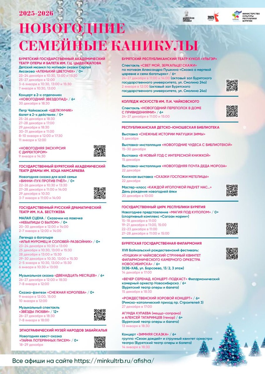 🎄 В Бурятии уже началась подготовка к самым тёплым и волшебным зимним дням! Театры, музеи, цирк, библиотеки и филармония приготовили праздничные программы для детей и взрослых! Приходите всей семьёй погрузиться в атмосферу чудес, света и добрых традиций. Пусть эта зима подарит вам новые эмоции, уют и вдохновение! ❄✨ Узнать поподробнее о представлениях и приобрести билеты можно на сайтах и в социальных сетях учреждений: Бурятский театр оперы и балета: https://vk.cc/cHhma0 Русский драматический театр им. Н. Бестужева: https://vk.cc/cRYasg Бурятский драматический театр им. Хоца Намсараева: https://vk.cc/cGXDK4 Театр кукол Ульгэр: https://vk.cc/cL2vhM Бурятская государственная филармония: https://vk.cc/csEmsJ Цирк Бурятии: https://vk.cc/cRYbeG Этнографический музей народов Забайкалья: https://vk.cc/cRYbpR Национальный музей Республики Бурятии: https://vk.cc/cSGcha Национальная библиотека Республики Бурятия: https://vk.cc/cSGc9D Республиканская детско-юношеская библиотека: https://vk.