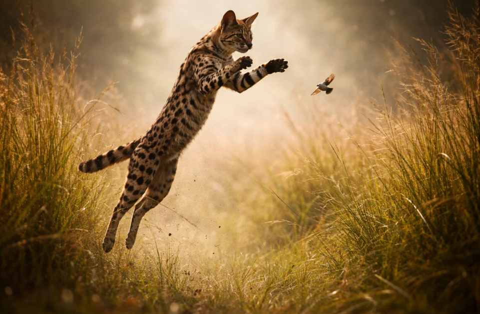 Феноменальная прыгучесть сервала — результат тончайших эволюционных адаптаций. Его длинные задние конечности обладают мощной мускулатурой, особенно развиты мышцы бедра и голени. Кости лап удлинены и прочны, работая как идеальные рычаги. При прыжке сервал отталкивается одновременно обеими задними лапами, создавая мощный импульс. Его позвоночник гибкий и пружинистый, помогая накопить и резко высвободить энергию. Вес тела распределен таким образом, чтобы максимизировать силу толчка при минимальных энергозатратах. Благодаря этому он способен совершить вертикальный прыжок на высоту до 3 метров из положения стоя, а в длину его прыжки могут достигать 3,5-4 метров. Для сравнения: это все равно что человек среднего роста прыгнул бы с места на крышу двухэтажного дома.