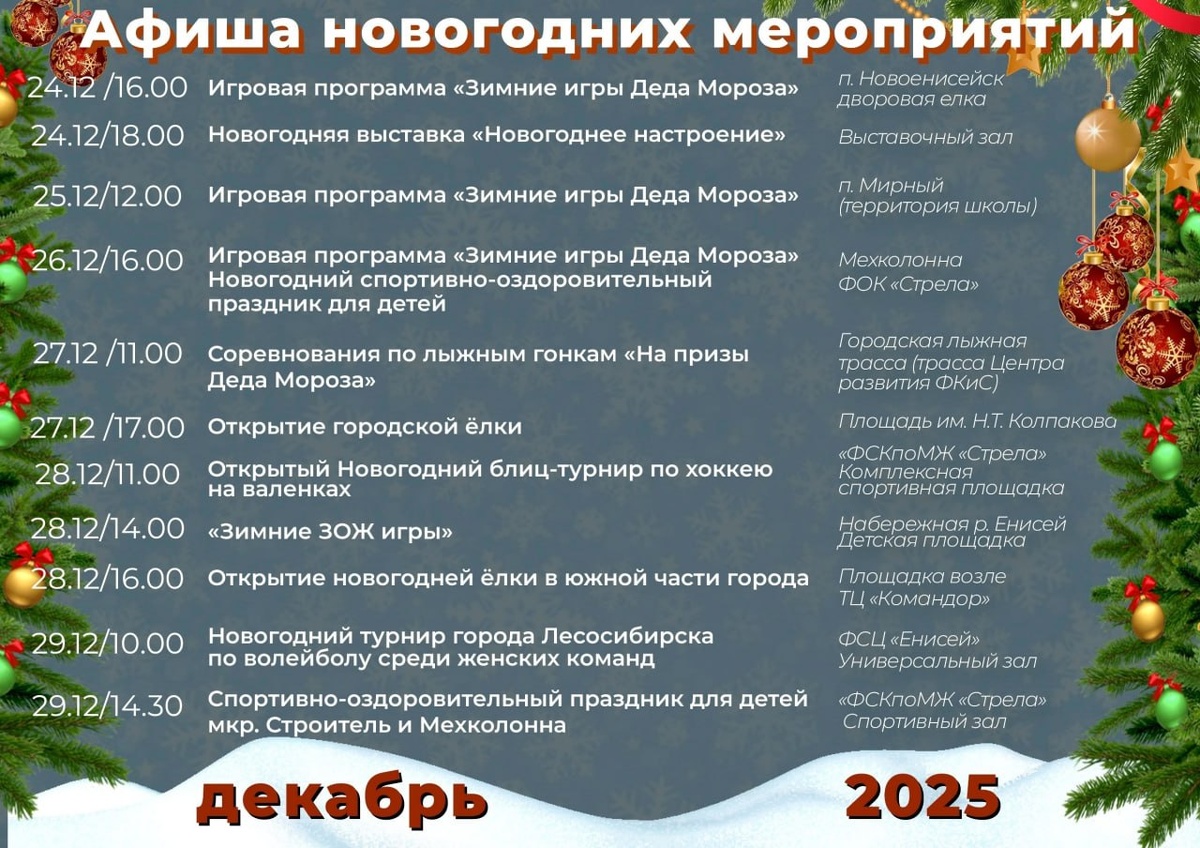 ! ✨ Новый год уже на пороге, администрация Лесосибирска приготовила для вас настоящую праздничную сказку! 🎅🎄 👉 Приходи сам и приводи друзей — вместе будет ещё веселее! 👥 Сохраняйте себе афиши, чтобы не забыть о новогодних мероприятиях города Лесосибирска.