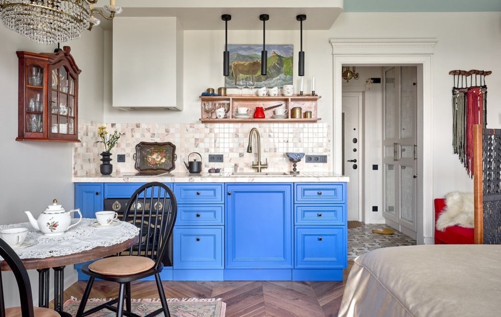 Заказчица хотела интерьер, который передавал бы атмосферу Франции, с интеллектуальными нотками, уютом и теплом Место: Москва Метраж: 25 кв. м Комнаты: 1 Cанузлы: 1 Высота потолков: 2,6 м Бюджет: 2 млн рублей Дизайн: Арина Дудникова Фото: Сергей Благодыр Хозяйка квартиры работает врачом-сомнологом. Перед дизайнером Ариной Дудниковой стояла увлекательная задача — создать яркое и живое пространство, без привычных серо-бежевых сочетаний. Особое внимание уделялось функциональности: интерьер должен быть удобным для жизни, продуманным и наполненным историей, деталями и многогранностью. В небольшой студии удалось разместить спальню, кухню, рабочую зону и уголок для отдыха. Также в квартире есть небольшая прихожая и совмещенный санузел. Студия находится на тридцатом этаже, и потолок решили сделать продолжением пространства за окном. Для этого выкрасили его в цвет неба, а стены — в приятный жемчужный оттенок. Ориентация квартиры на закат вдохновила на использование сочных оттенков, впитывающих с