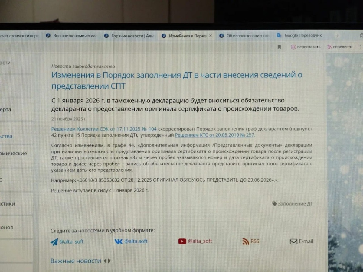 Вот такое письмо счастья на прошлой неделе прилетело во все чаты и группы с декларантами. С 1 января 2026 года вступают в силу изменения в порядке заполнения таможенной декларации, которые коснутся всех, кто работает с импортом. ‼️ Если ваш товар требует сертификата о происхождении (СТ-1, FORM A и др.), то теперь нужно будет обязательно передавать в таможню оригинал документа. Сканы больше не будут принимать. Увы и ах 😔 Поэтому стоит внимательно проверить документы и убедиться, что сможете оперативно предоставить оригиналы, иначе проблем не избежать. 📱 Вконтакте 📱 Дзен 📱 YouTube