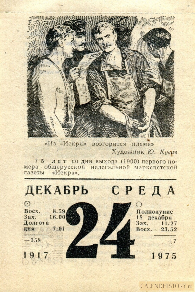 24 декабря 1975-го года — Календарь для женщин «Из «Искры» возгорится пламя». Художник Ю. Кугач 75 лет со дня выхода (1900) первого номера общерусской нелегальной марксистской газеты «Искра». Больше старых советских отрывных календарей смотрите у нас на сайте - calendhistory.ru https://calendhistory.ru/24-dekabrja-1975-go-goda-kalendar-dlja-zhenshhin/