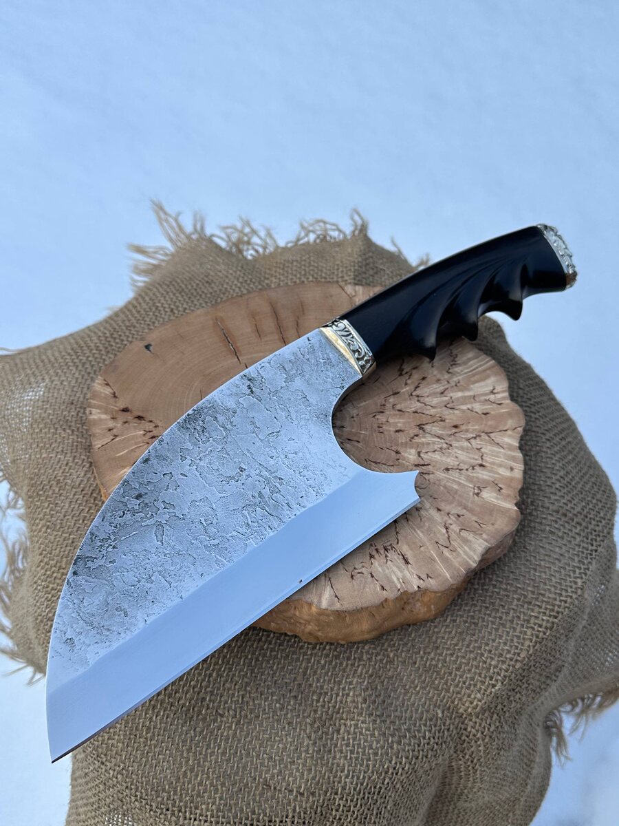 Будет удобен для шинковки или нарезки, мяса и зелени. Рукоять теплая из черного граба. Заточены как бритва. Твердость клинка (HRC): 64-65 Цена за нож: 23.225 рублей, со скидкой: 14.541 рубль. В комплекте идут ножны из натуральной кожи. Можем сделать формованные ножны +15000 рублей. Для заказа писать на @Nazarklinokbot или по тел +79101343831 WhatsApp/Viber