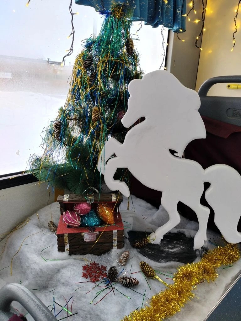 Когда по окончании смены в депо подъехал голубой троллейбус девятого маршрута, за рулем которого находилась сменщица Наталья Демидович, мы вместе с Валентиной Васильевной вошли внутрь салона. Боже мой! Я как будто попал в мир светлой сказки, где были Дед Мороз и Снегурочка, Царица-Лошадь и белый медведь с пингвином, игрушки на красавицах-елках и блестящие гирлянды, а потолок украшен звездами и снежинками. Да это не салон троллейбуса, а настоящее чудо на колесах! И какой пассажир, действительно, не выразит восхищения перед такой-то красотой?!