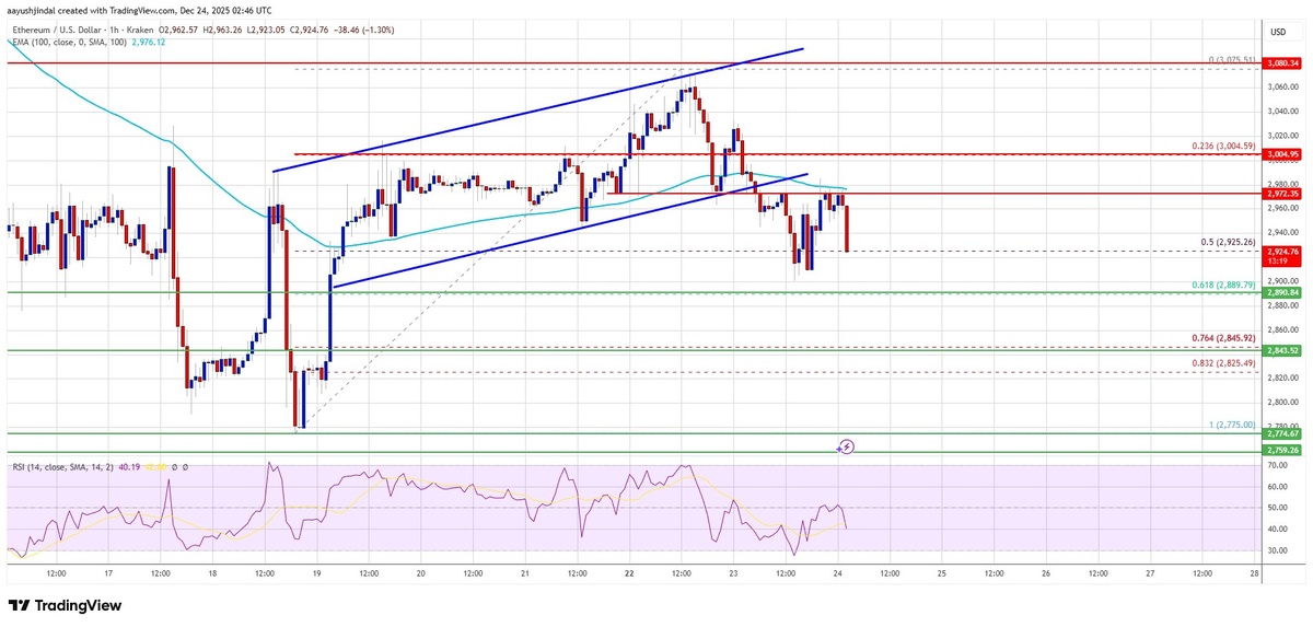 Цена: $2,950 У ETH сегодня нестабильность: цена потеряла ключевую поддержку в 3 000 € и вошла ниже 2 950 € и 100‑часовой SMA. Быки уже пробили 2 980 €, и теперь поддержка – 2 880 €. Если удержание за 2 880 € потеряется, цена может стремительно упасть до 2 845 €, 2 800 € и даже 2 775 €. MACD и RSI подтверждают медвежий тренд, а ближайшие уровни сопротивления – 3 000 €, 3 050 € и 3 120 € – являются потенциальными барьерами для подъема. 📊 Ключевые моменты: - 100‑час SMA & 3 000 € пробиты, цена удерживается 2 880 € - MACD & RSI подтверждают медвежий тренд - Сопротивление 3 050 €, 3 120 € – возможные барьеры ⚠️ Если цена пробьет 2 880 €, следующее падение может достать до 2 845 €, 2 775 € Горизонт: короткосрочный, наблюдать за 2 880 €