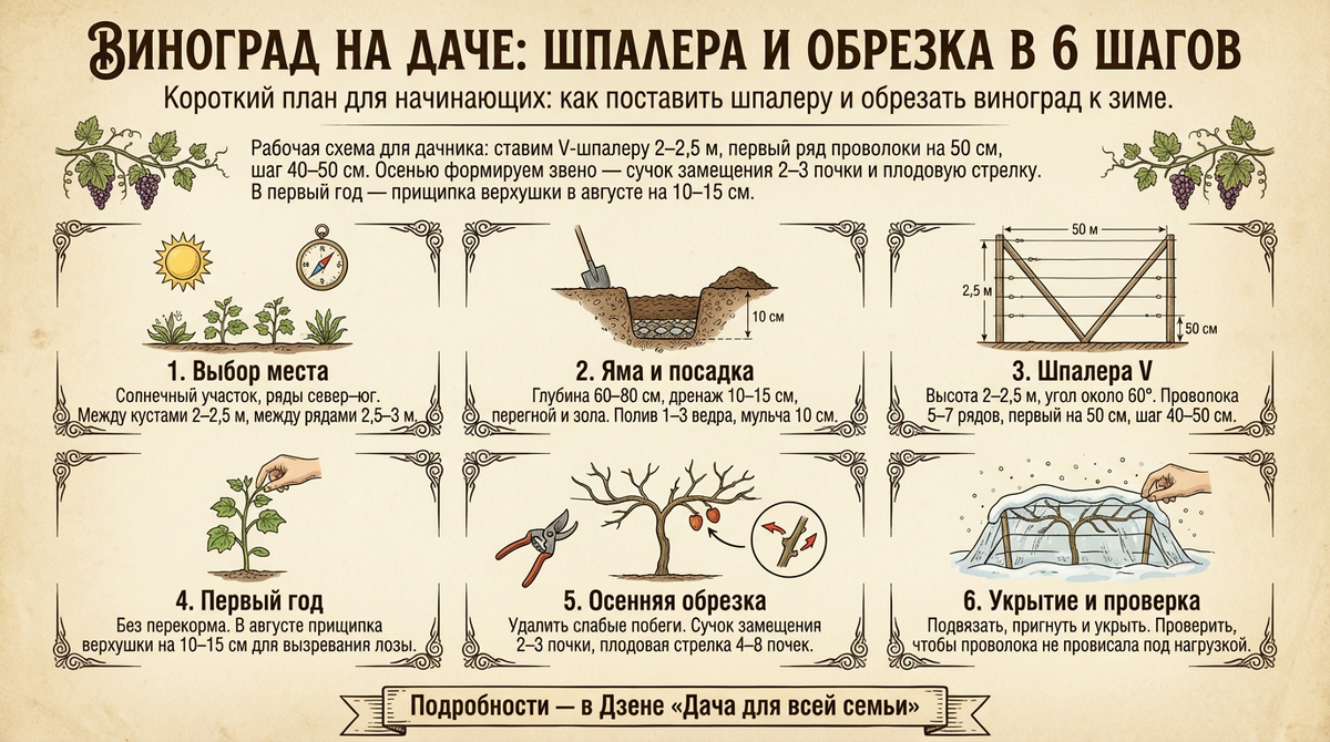 Скажу по делу: для начинающих работает простая связка — двухплоскостная V-шпалера высотой 2-2,5 м с первым рядом проволоки не ниже 50 см от земли, шаг рядов 40-50 см, расстояние между кустами 2-2,5 м. По обрезке: в первый год в августе укорачиваем верхушку молодой лозы на 10-15 см, чтобы она одеревенела, а на зиму у укрывных сортов режем коротко на 2-4 почки. Посадочную яму делаем 60-80 см с дренажом и мульчой. Эти три вещи — место, опора и обрезка — задают весь дальнейший рост.