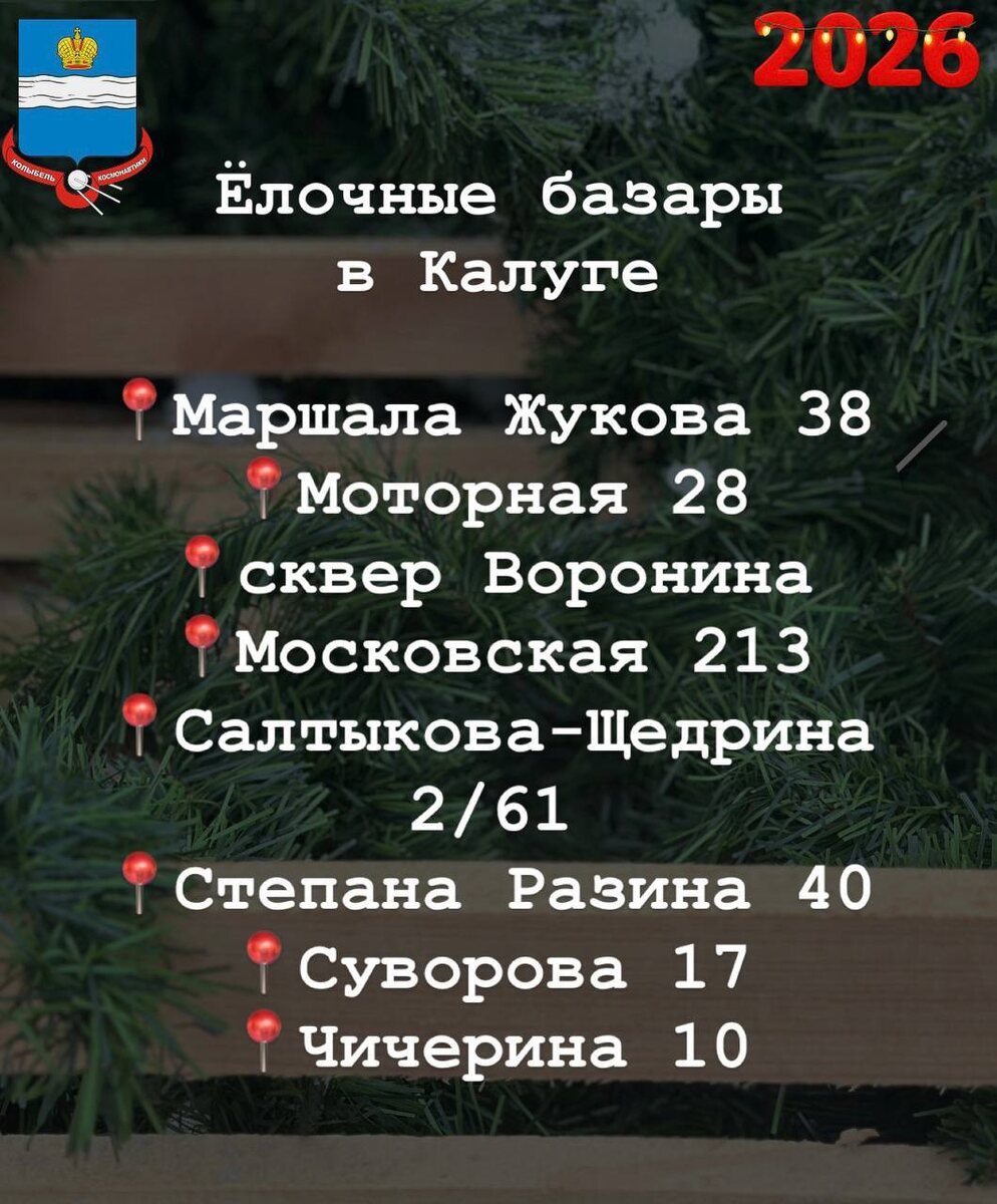 ◾ В Калуге заработали ёлочные базары. За живой ёлочкой - по адресам на картинке.
