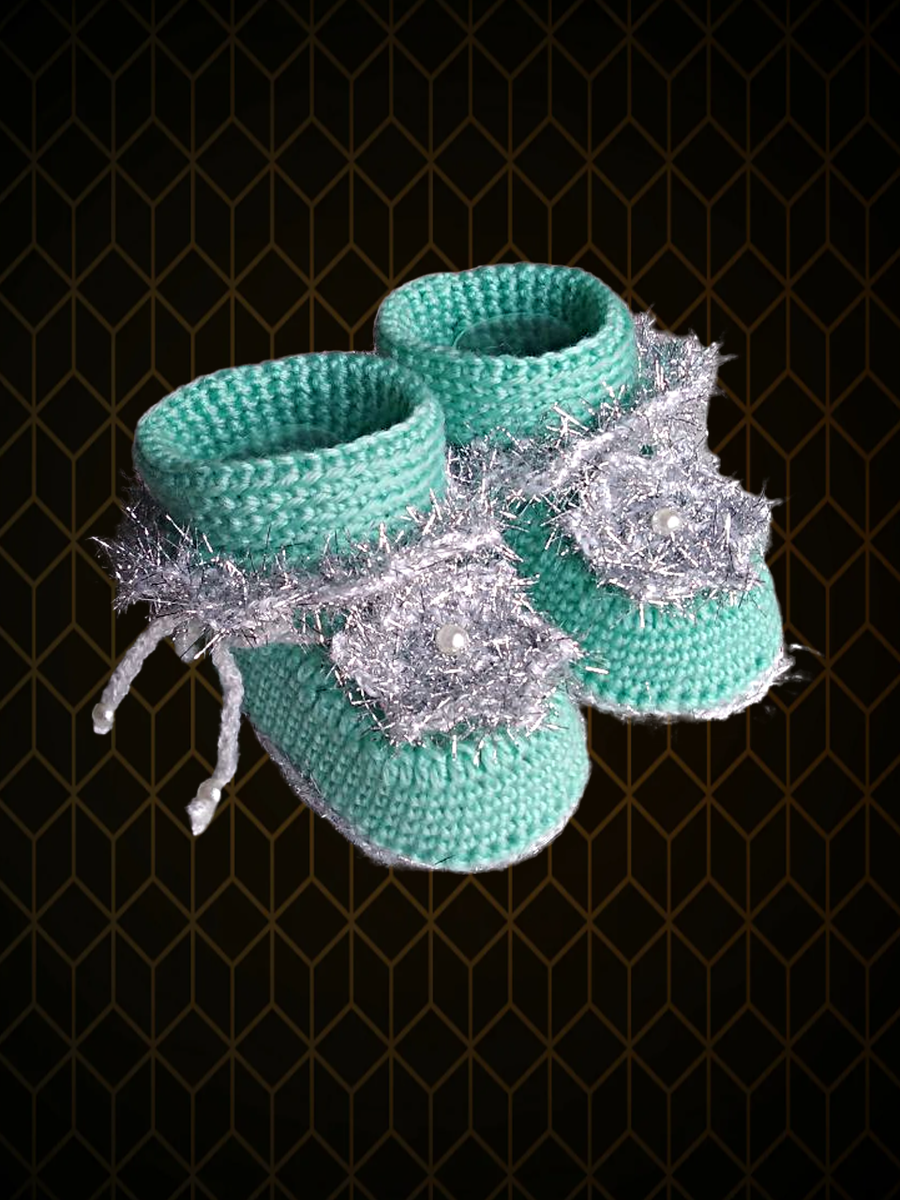 Вязаные пинетки для детей (универсальная модель, подходит для девочек и мальчиков) связаны из шелковистой полушерсти, нежной и гладкой произведённой по германской технологии. Пинетки невероятно мягкие и легкие, не вызывают раздражения и не колются, что особенно важно для нежной детской кожи. Вязаные пинетки украшены сверкающим мягким кружевом, пришивной аппликацией снежинок с жемчужными бусинами. Шнуры так же украшены бусинами. Декоративная сверкающая нить мягкая, не колется и отлично подходит для украшения детской одежды. Такие пинетки станут лучшим подарком для новорождённого малыша на выписку и на первый месяц жизни! Размер: длина подошвы 8 см (без натяжения) Цвет: нежный мятный оттенок с белыми шнурами Состав: 45% шерсть австралийского мериноса / 55% акрил