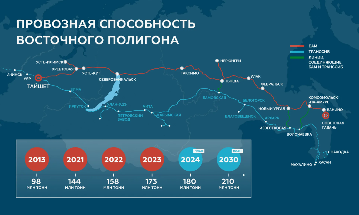 Восточный полигон сегодня наращивают потому, что растёт потребность в перевозках на восток — к портам и погранпереходам. В планах третьего этапа — довести провозную способность магистралей до 270 млн тонн к 2032 году, а к 2030 — выйти на промежуточные цели.