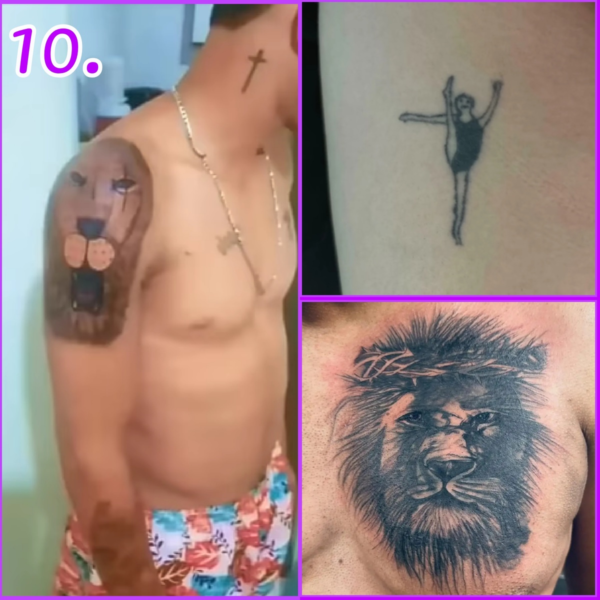 Традиционный топ-10 худших татуировок года. Показываю чернила, которые насмешили, вызвали недоумение и даже отвращение в 2025 году. Начну с простенького – милых таких партачков, когда мастерства татуировщика не хватило для реализации задумки. И гимнастка здесь совсем не воздушная, не изящная; ну, а грозные (по идее) львы получились скорее милыми и даже немного мультяшными. Эх, не экономьте на татуировке! Ищите хорошего мастера, тогда рисунок точно будет радовать! Глядя на эти татуировки, вопрос «Эт чё?!» возникает в голове сам собой. Топорный узор на лбу очень напоминает дизайн упаковки кетчупа «Heinz». О смысле «художества» лучше даже не задумываться))) А что за кривое слово набито у чувака на фото справа? Madinty? Mcdinty? Mcdirty? Не впечатляет такое, скорее вызывает смех, ну, и любопытство, конечно – чего ж тут написано? А, может, на то и расчет? Не думаю, что дедушка был бы рад такому неумело сделанному портрету. Тату-портрет это все-таки про реализм, а это один из самых сложных