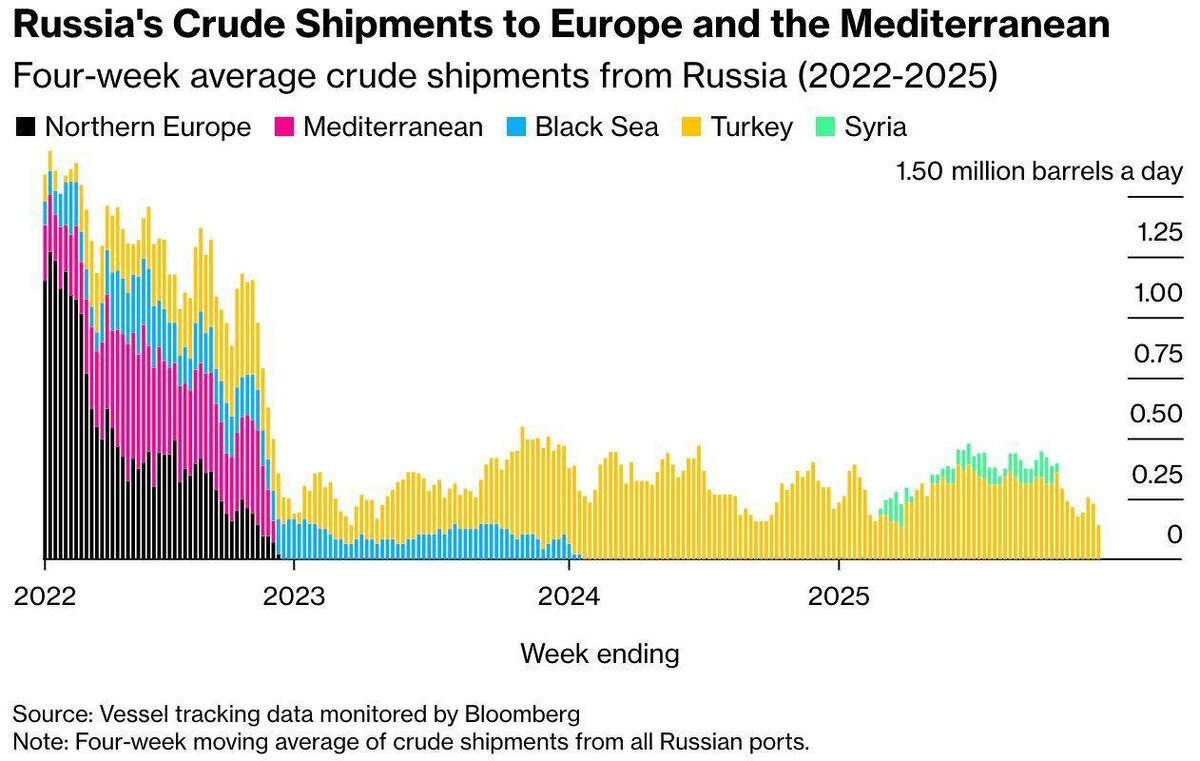 По данным агентства, как минимум 20 танкеров с российской нефтью ожидают разрешения на разгрузку у берегов Китая и Индии, а доставка отдельных партий занимает месяцы. Несмотря на рекордные объемы экспорта (около 3,9 млн баррелей в сутки), Россия сталкивается с трудностями при физической разгрузке нефти из-за санкций. Объем российской нефти, находящейся на танкерах, с конца августа вырос почти на 50%. Ситуацию усугубляет усиление действий США против судов, перевозящих санкционную нефть из Венесуэлы, что заставляет перевозчиков и покупателей опасаться аналогичных мер в отношении российских грузов. На фоне избытка предложения и слабого спроса цены на российские сорта нефти продолжают снижаться, а Москве приходится предоставлять все большие скидки, чтобы найти покупателей. Семченко 👈 Подписаться