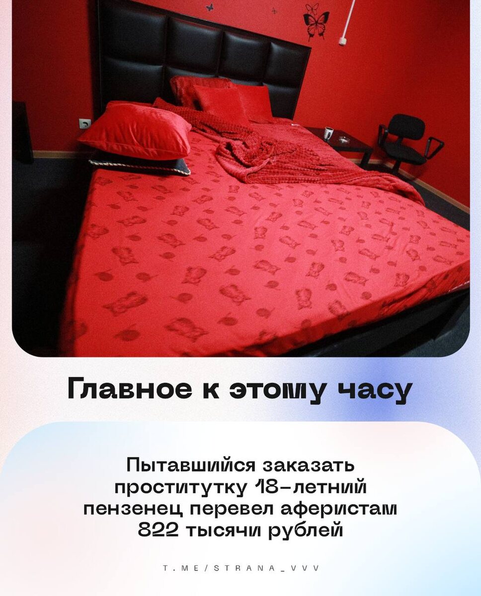 : 🔹Пытавшийся заказать проститутку 18-летний пензенец перевел аферистам 822 тыс. рублей. 🔹Суд в Москве арестовал счета Чубайса почти на 11,9 млрд рублей по иску «Роснано» — СМИ. 🔹Мошенники стали похищать паспортные данные под предлогом оформления пропуска на территорию военкомата. 🔹Средняя пенсия в РФ за два года выросла на 20% и составляет 23,5 тыс. рублей — данные Соцфонда. 🔹За ночь над регионами России сбито 172 украинских БПЛА — Минобороны. 💰Курсы валют: доллар — 📉78,58; евро — 📉92,81; юань — 📉11,15. ✅ «В Стране» в MAX
