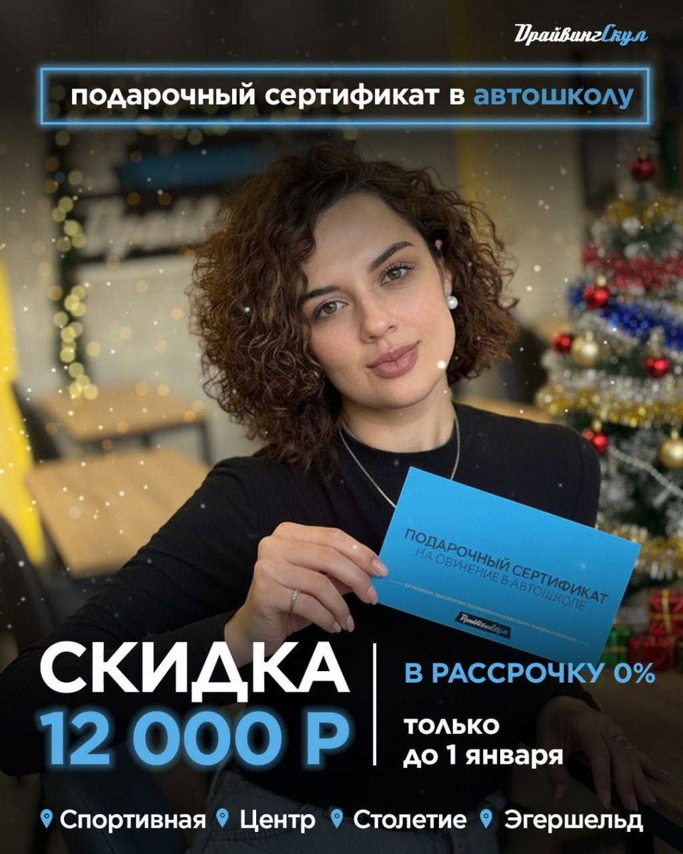 🎄 Подарочный сертификат в автошколу ДРАЙВИНГСКУЛ за 45 900 ₽ только до 1 января! Приобрести можно в рассрочку от автошколы без банков и переплат, с первым взносом всего 9 000 ₽ ⚡️ ДРАЙВИНГСКУЛ уже 12 лет выпускает уверенных водителей на дороги Владивостока. Учиться можно в одном из четырёх филиалов: 📍Спортивная 📍Столетие 📍Эгершельд 📍Центр Или онлайн. Сильный преподавательский состав сделает изучение теории интересным и простым для понимания. А инструкторы подготовят не только к сдаче экзамена, но и к вождению в реальной жизни. Почему ДРАЙВИНГСКУЛ? - Рассрочка от автошколы без процентов - MAX практики на всех экзаменационных маршрутах - Современный автопарк - Группы в будние дни - Группы в выходные дни - Категории А и В Пожари свободу и независимость тому, кто об этом давно мечтал 💙 Получить консультацию можно по телефону: +7 994 0000 266 (Звонки, WhatsApp и Телеграм) Или оставить заявку на нашем сайте: https://drivingschoolvl.ru/