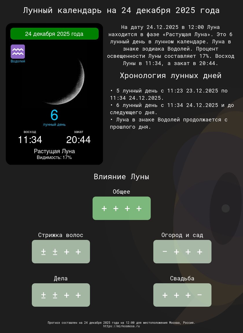 ! 🔹🌗 Лунный календарь на 24 декабря 2025 года — Что приготовила Луна? Подробнее 🔹✂️ Лунный календарь стрижек на 24 декабря 2025 года — Подходящий ли день для обновления прически? Подробнее 🔹🌱 Лунный календарь огородника и садовода на 24 декабря 2025 года — Лучшее время для ухода за растениями. Подробнее 🔹📅 Лунный календарь дел на 24 декабря 2025 года — Удачные моменты для важных задач. Подробнее 🔹💍 Лунный календарь свадеб на 24 декабря 2025 года — Подходит ли этот день для вашего торжества? Подробнее