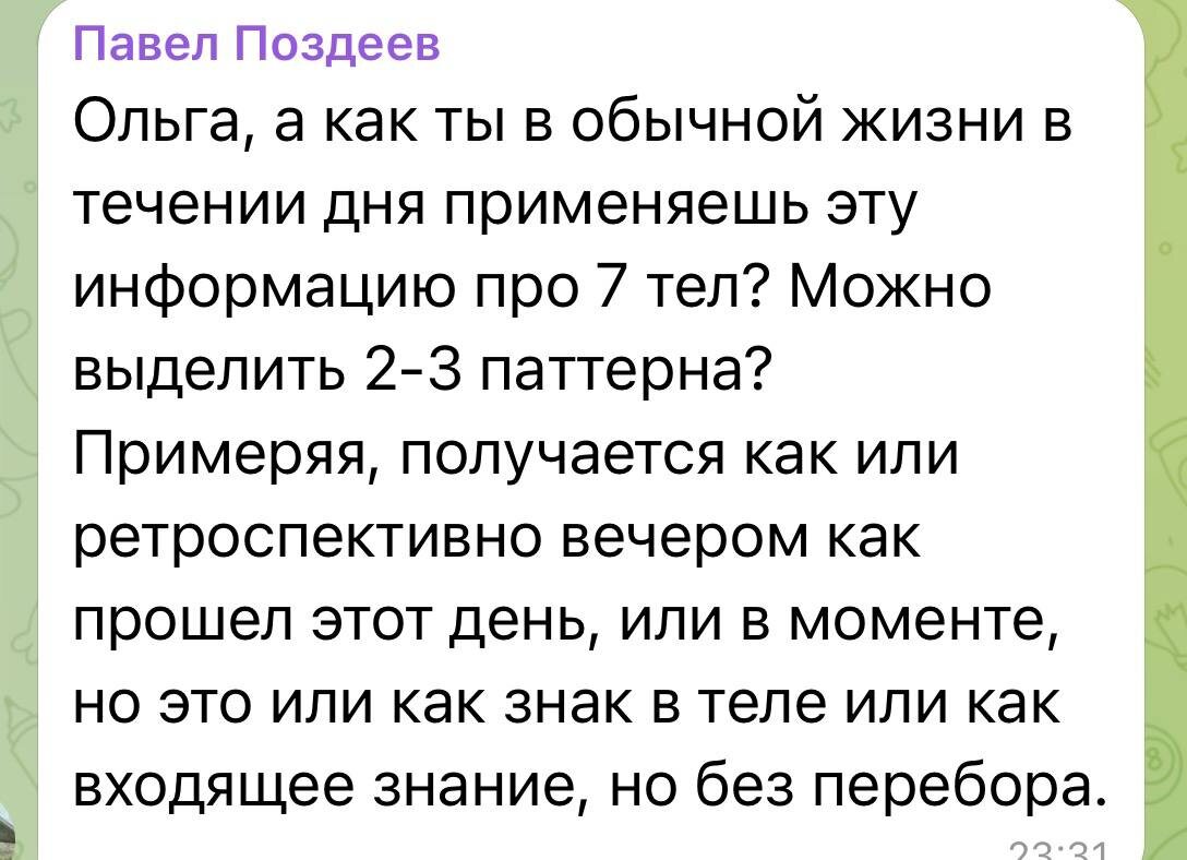 Как попасть в Творца, через знание 7 тел? Отвечу на примере — смотри: допустим условный Вася нарезал хлеб и порезал палец. Что происходит? 🔴Появилась боль, пошла кровь — сигнал тела. 🔴Возникла эмоция в связи с ситуацией. 🔴Появились мысли. Самое главное в этой ситуации - осознать, что Вася не тело у которого порезан палец, не проявившиеся эмоции и не появившиеся мысли. Что между Васей и всеми этими проявлениями есть дистанция, расстояние. Вася не залип: не стал пальцем/телом, эмоцией или мыслью, он не отождествлен. Этого уже достаточно. Потом Васе можно поразмышлять: а чего это я порезал палец? И может быть сходить на аудиенцию к причинному телу и рассмотреть повторяющийся в этой жизни паттерн, с точки зрения накопившихся причин. А дальше, что? Дальше может возникнуть вопрос - а кто же Я? Если я не тело, не эмоции, не мысли, то кто Я? И так, постепенно, клубок начинает разматываться и вести Васю к себе. Вариантов выхода в Творца много: кто-то медитирует, кто-то проходит 8-мь ст