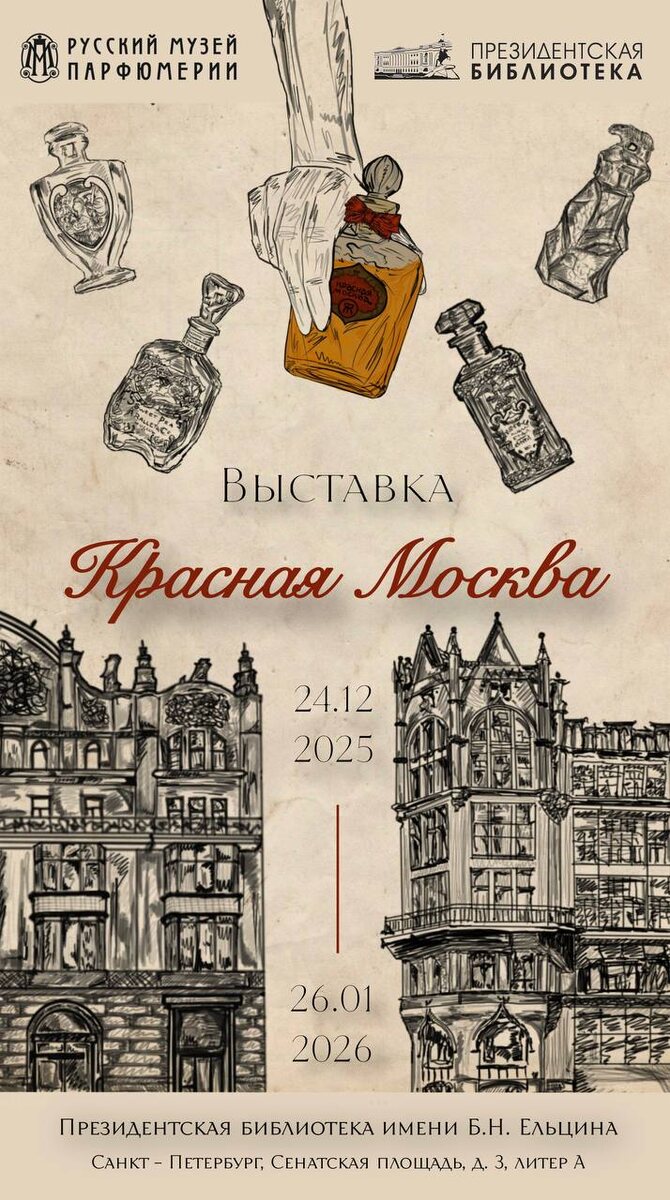 »! Экспозиция подготовлена Русским музеем парфюмерии совместно с Президентской библиотекой. Выставочный проект рассказывает о Москве 1920-х годов, изменениях в культурной, социальной и промышленной сферах жизни нового советского общества, а также об одном из самых известных и культовых символов СССР – духах «Красная Москва», созданных на московской парфюмерной фабрике «Новая Заря» почти сто лет назад. Подробнее о выставке. ❤️24 декабря 2025 – 26 января 2026 📍Санкт-Петербург, Cенатская площадь, 3, литер А 🌸Вход в библиотеку возможен только по предварительной записи. Для записи и дополнительной информации: Телефон: +7(812)334-25-14 Почта: expo@prlib.ru
