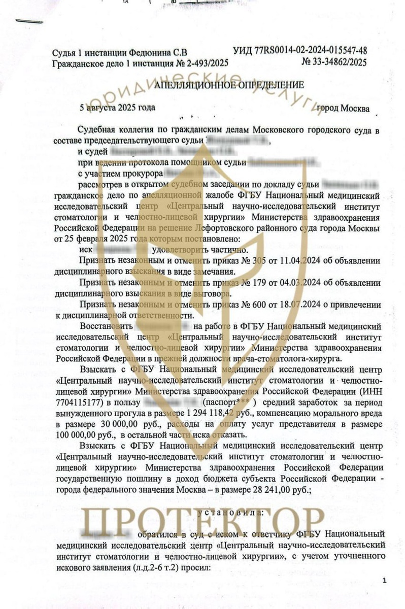 #успешныйкейс Работодатель попытался уволить нашего клиента — врача — по дисциплинарной статье. Мы доказали в Лефортовском районном суде г. Москвы, что это незаконно, и суд взыскал в пользу врача 1 424 118 рублей. Работодатель подал апелляцию, но мы снова победили. Мосгорсуд оставил решение без изменения. Незаконное увольнение обошлось компании-ответчику дорого. 🛡Отстояли права клиента в полном объеме. Работаем на результат. Ваши права — наша защита. #Протектор #ТрудовыеСпоры #НезаконноеУвольнение #ЗащитаПрав