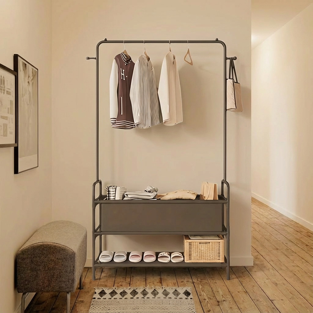 Главный принцип для прихожей любого размера — каждый предмет должен работать «за двоих»: освещать и хранить, отражать и прятать, украшать и организовывать. Тогда даже маленький коридор будет выглядеть как продуманное пространство, а не место, где просто снимают обувь. 1. Вешалка вместо шкафа: капсульный гардероб у двери Забудьте о забитом до отказа шкафе в узком коридоре — открытая вешалка позволяет оформить одежду как аккуратный капсульный гардероб.