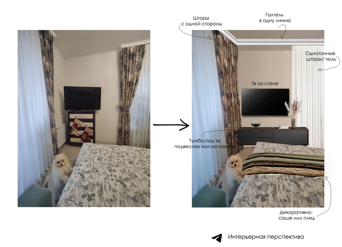 Запрос: исправить зону ТВ, скрыть радиатор. Для полного просмотра текста разверните его: Конечно, лучше прикладывать план помещения с существующей расстановкой мебели, возможно, подправить можно было что-то передвинув или убрав/добавив. Но работаем с конкретной зоной. ❌ Мебель в комнате несомасштабна: крупный диван/кровать визуально доминируют, а комод и телевизор выглядят слишком мелкими для этого пространства. ✅Чтобы поддержать пропорции и крупные предметы не «перетягивали» внимание на себя, а мелкие не терялись на их фоне, предлагаю: 🔘Убрать акцентные шторы справа от телевизора. Их можно добавить к навешенным слева – получится более объемное и «богатое» текстильное оформление одного окна, на втором можем оставить только тюль или однотонные шторы + римские/ рулонные (по необходимости). А можно штору напротив кровати перевесить ко второй только по краям окон на каждой стене – слева будут две одинаковые шторы на одном окне и стене, и справа от телевизора тоже будут двойные одинак