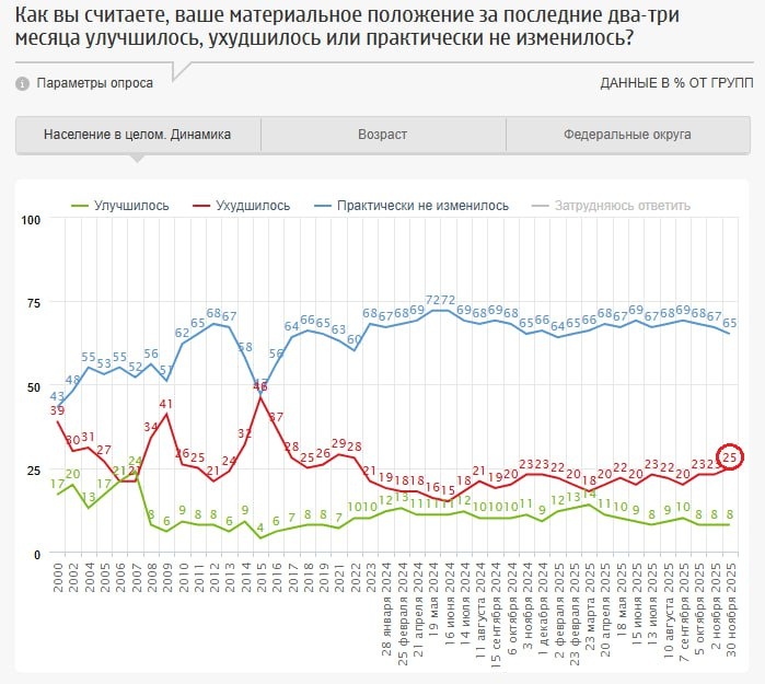 25% россиян считают, что их финансовое положение ухудшилось Такие данные приводят аналитики Фонда «Общественное мнение» (ФОМ). Четверть опрошенных отметили, что ощущают падение уровня жизни. 65% респондентов сообщили, что их материальное положение не изменилось, и лишь 8% заявили об улучшении. При этом 25% россиян считают, что их финансовое положение в ближайший год улучшится. 35% респондентов считают, что за год уровень жизни не изменится. 19% ожидают ухудшения. Самой оптимистичной возрастной группой оказалась молодежь. Люди в возрасте от 18 до 30 лет надеются на улучшение финансового положения в ближайший год – об этом заявили сразу 44% респондентов. В остальных диапазонах преобладает нейтральный настрой. Напомним, ранее глава X5 Group Екатерина Лобачева сообщила о замедлении роста потребления с 6-8% до 2% – россияне стали чаще экономить на продуктах. Данные: Фонд «Общественное Мнение» ТВК