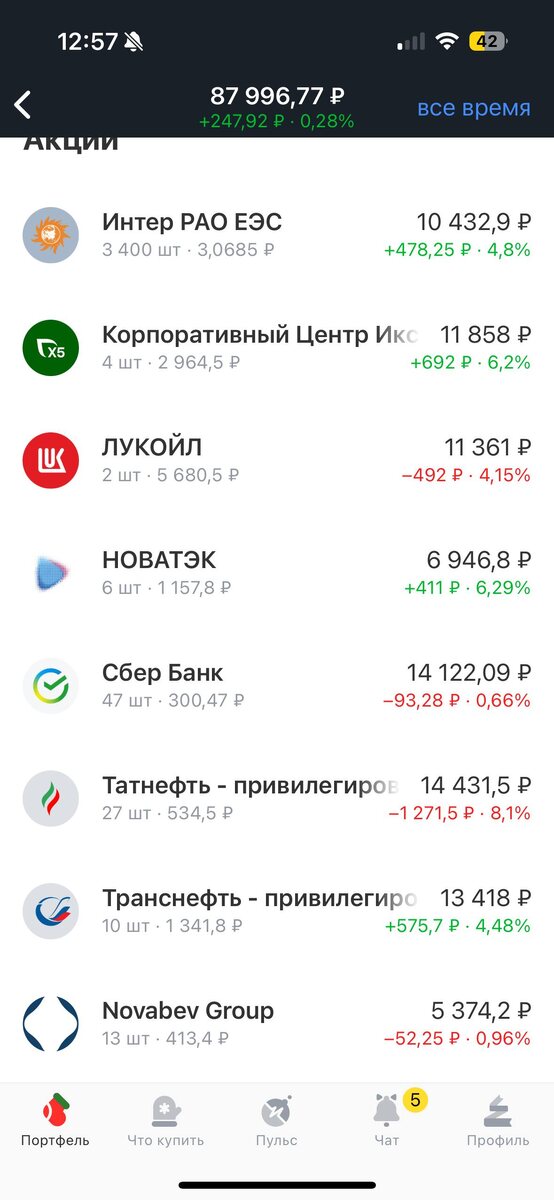 ❄️ День #247 💰 Всех приветствую! Рынок продолжает немного корректироваться, что совсем не похоже на новогоднее ралли, а кому оно нужно? Тем временем - в следующую среду уже 31 декабря, а погода решила резко поменять курс на зимний, у нас с +1 -1, резко стало -15, а у коллеги из республики Коми ожидается -40 😨, жуть. Снегу на Новый год - быть Я продолжаю заниматься тем, чем и занимаюсь 247 дней - делаю пополнение, сегодня в размере 450 руб., и покупаю 1 акцию Белуги 🍷, можно сказать половину от 1 единицы производимого ей продукции 😅 Продолжаю пополнения и выращиваю дивидендный поток, честно говоря очень интересно будет вернуться сюда ровно через год, в декабре 2026, и сравнить что дает мне этот портфель, думаю я буду доволен, через 12 месяцев напишу. Хотелось бы видеть в конце декабря 2026г - прогнозируемые выплаты на следующие 12 месяцев - 30 000/год или 2500/мес., посмотрим насколько это будет близко Всех с наступающим Новым годом, пусть все ваши мечты сбываются ❤️ • Стоимост
