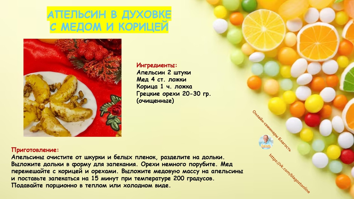 🌀 Ингредиенты: Апельсин 2 штуки Мед 4 ст. ложки Корица 1 ч. ложка Грецкие орехи 20-30 грамм (очищенные) 🌀 Приготовление: Апельсины очистите от шкурки и белых пленок, разделите на дольки. Выложите дольки в форму для запекания. Орехи немного порубите. Мед перемешайте с корицей и орехами. Выложите медовую массу на апельсины и поставьте запекаться на 15 минут при температуре 200 градусов. Подавайте порционно в теплом или холодном виде.