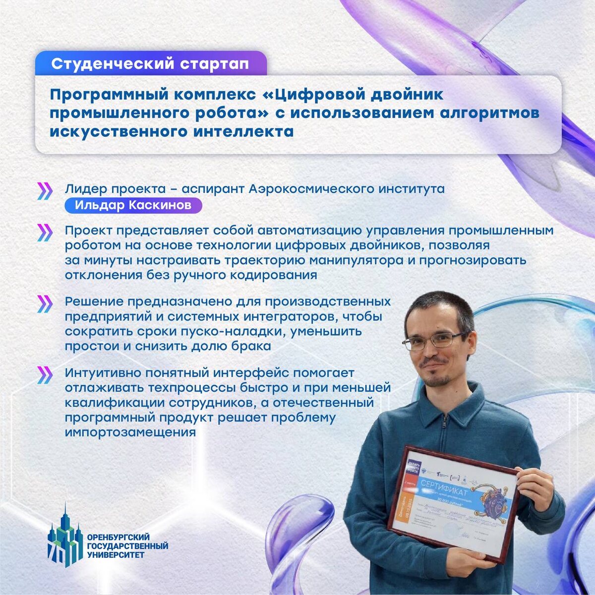 🤖 Четвертый сезон акселератора «Думай! Действуй! Воплощай!» выдался невероятно продуктивным. В рубрике #МойСтуденческийСтартап – пришла пора рассказать о проектах-победителях. Третье место заняла идея аспиранта Аэрокосмического института Ильдара Каскинова. Он вместе со своей командой представил идею по автоматизации управления промышленными роботами на основе технологии цифровых двойников 🙌 Благодаря данной разработке будет обеспечиваться существенное снижение вероятности брака и экономия времени на корректировку программного алгоритма из-за накапливающейся ошибки и погрешностей при достижении точек сингулярности концевого эффектора. «В ближайшем будущем планируем развивать проект и расширять команду, добиваться коммерциализации продуктов, работать над маркетингом и менеджментом, выходить на федеральные и международные рынки», – подчеркнул Ильдар. Тоже хочешь погрузиться в мир технологического предпринимательства? Тогда приходи в Институт управления проектами и Стартап-студию ОГУ