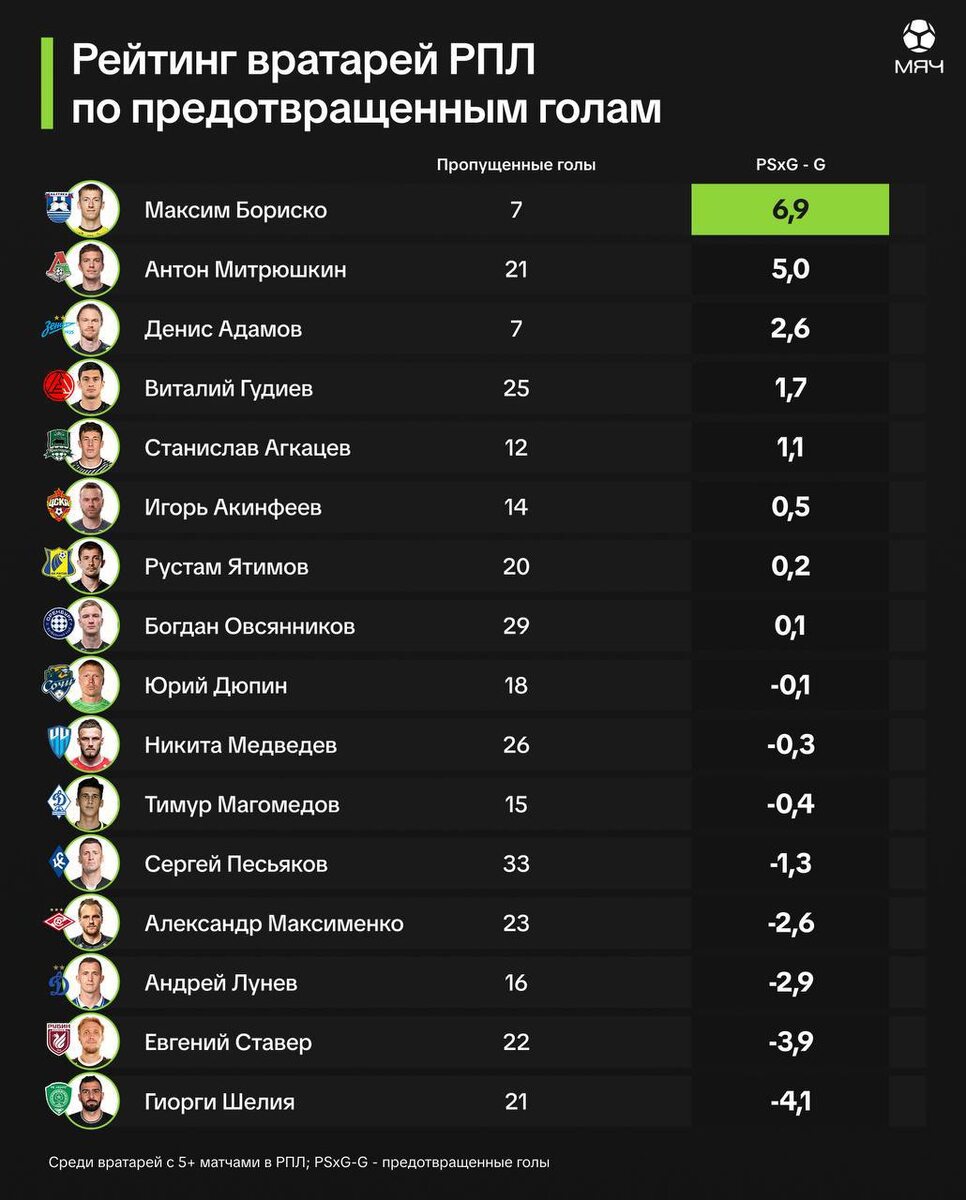 *PSxG (Post-Shot Expected Goals) оценивает качество ударов в створ и показывает, насколько эффективно действует вратарь. Положительное значение говорит, что кипер отражает больше, чем ожидается по модели, отрицательное — что играет менее эффективно. 🤩Подписаться | Вступить в чат