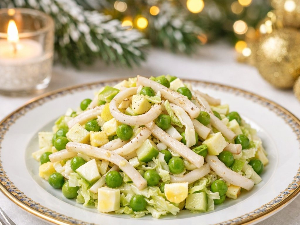 Лёгкий, оригинальный салат на Новый год , любой праздник и на каждый день, который порадует гостей и всю семью. Идеально сочетает вкус кальмара, свежесть сладкого зелёного яблока, хрустящую пекинскую капусту, яйца и нежный зеленый горошек, заправленный майонезом. Он яркий, свежий и прост в приготовлении. Прекрасный выбор для дам. Салат с кальмаром и яблоком — идеальный выбор для тех, кто хочет приготовить легкий, свежий и сытный салат на праздник. Он сочетает в себе морской вкус, фруктовую свежесть и хрустящие овощи с яйцами — сочетание, которое придется по вкусу и вам, и гостям. 💡 Попробуйте этот рецепт на Новый год, на семейный или праздничный ужин — он прост в приготовлении, красиво смотрится на столе и легко готовится даже в будние дни.