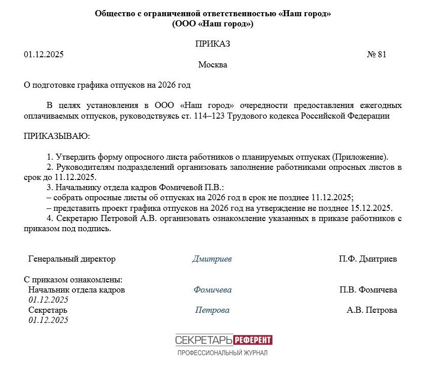 Работа над подготовкой графика отпусков начинается после того, как руководитель организации издал соответствующий приказ (Пример). В нем назначается ответственный за подготовку документа и обозначаются сроки выполнения работы.