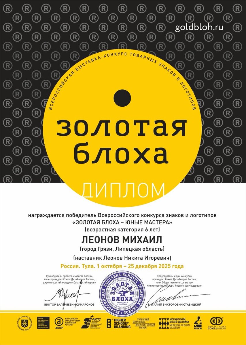 Был и детский вариант. Отправил туда логотип своего ребенка, уточнив, можно ли отправить знак, который рисовал ребенок на бумаге, а я оцифровал. Дали добро. Прислали Диплом Победителя для Леонова Михаила, а меня вписали туда наставником. От основного конкурса прислали юбилейный диплом. Ни в одной номинации я не победил, а тех коллег кто был награжден — сердечно поздравляю, знаю вы тут читаете некоторые =) Вообще, есть вопросы к некоторым знакам — как оказались в лонг листе, и парочка странным образом попала даже в шорт лист, который отбирали эксперты. Некоторые мои крепкие знаки, которые всоко оценили коллеги на других площадках не прошли даже в лонг, но к сожалению этот вопрос оставили без комментариев. В любом случае учавствовать стоит. Это хороший опыт. Золотая Блоха — единственный в России подобного рода конкурс для логотипов и знаков. Ошибки случаются, прислано было 5000 знаков, разумеется что-то проскочит или недоскочит — все делается на энтузиастах и без выделенного штата со