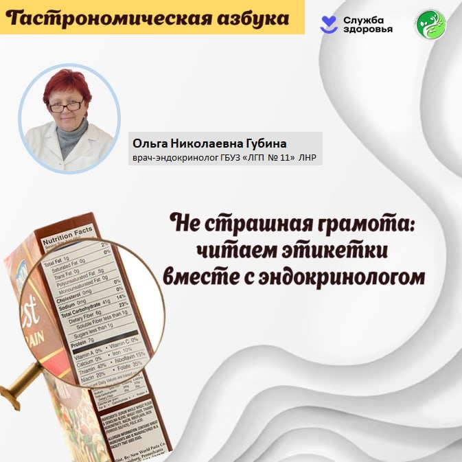— грамотному чтению этикеток. Часто мы покупаем «полезный» йогурт, «диетические» хлопья или «натуральный» сок, доверяя красивой упаковке. Но правда кроется в мелком шрифте на обороте. Наш врач-эндокринолог Ольга Николаевна Губина подготовила простую шпаргалку. 🔍Смотрите по порядку. Размер порции. Всё, что указано далее (калории, БЖУ), относится именно к этой порции. Часто пачка содержит 2-3 порции! Съев её целиком, вы получите в 2-3 раза больше сахара и жиров, чем думали. 🍭Сахар — главный «маскировщик». Ищите его не только в слове «сахар». Он прячется под именами: сахароза, глюкоза, фруктоза, мальтоза, патока, сироп (агавы, кукурузный, солодовый), нектар, концентрат сока, меласса. На что ориентироваться? ВОЗ рекомендует для здоровья потреблять не более 25-50 г добавленного сахара в день. Если в одной порции йогурта его 15 г — это уже много. Трансжиры (или гидрогенизированные/частично гидрогенизированные масла). Их лучше избегать совсем. Они повышают риск сердечно-сосудистых заб