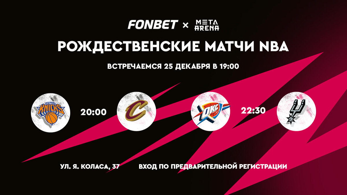 По доброй рождественской традиции НБА готовит для фанатов топовые матчи, и этот вечер не станет исключением. Программа начнется в 19:00. В 20:00 на огромном экране стартует первая игра – противостояние «Нью-Йорк Никс» и «Кливленд Кавальерс». В 22:30 внимание зрителей переключится на поединок «Оклахома-Сити Тандер» и «Сан-Антонио Спёрс».Зрителей ждет уникальная атмосфера живого матча благодаря гигантскому LED-экрану с идеальной картинкой, активности и конкурсы от FONBET. Это не просто просмотр – это общие эмоции и единство с такими же преданными фанатами игры.Вход на мероприятие свободный, но обязательна предварительная регистрация. Забронировать места для себя и друзей можно по телефону: +375 (29) 137-83-28.Ждем всех любителей баскетбола 25 декабря по адресу: г. Минск, ул. Я. Коласа, 37 (META ARENA).*Партнерский материал. ООО «БИЗОН БЕТ», УНП 192977976