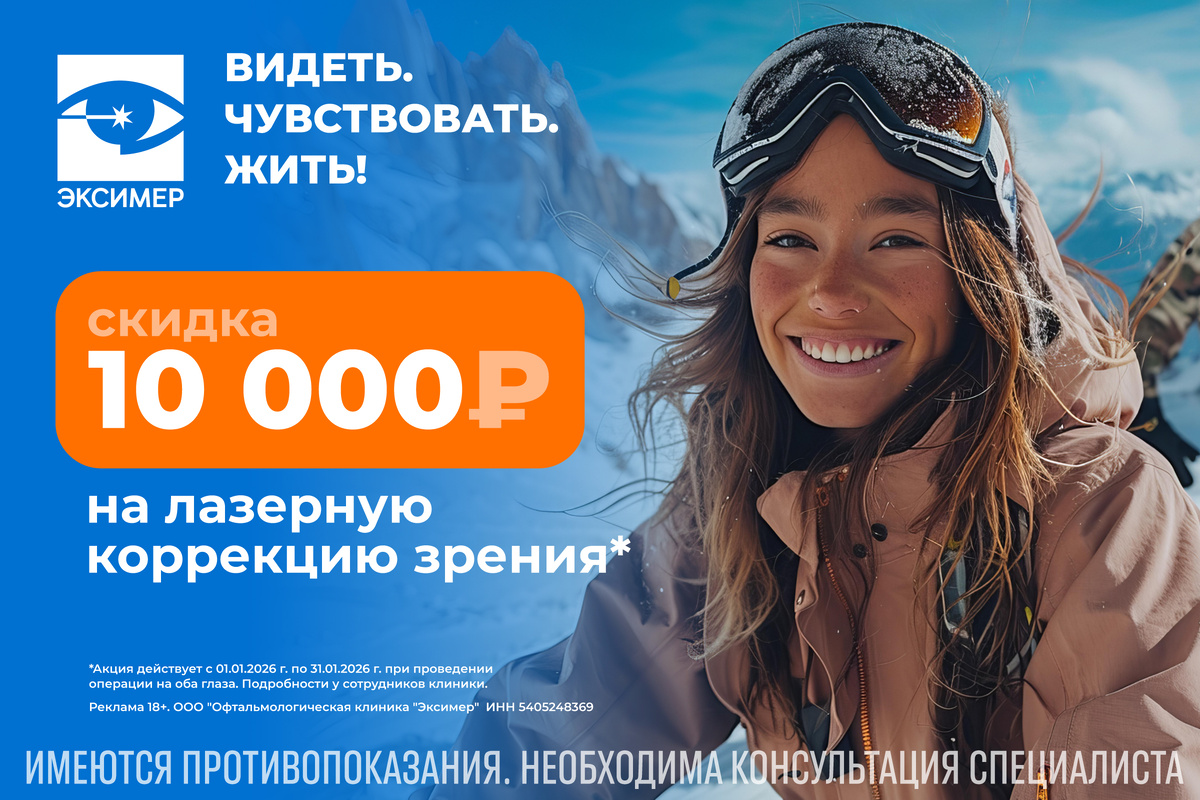 Мечтаете о зрительной свободе без ограничений? Передовые технологии лазерной коррекции — современный способ получить отличное зрение за секунды. Весь январь 2026 в клинике “Эксимер” в Новосибирске действует скидка 10 000 рублей на лазерную коррекцию зрения*. Начните год с отличным зрением! Почему для процедуры лазерной коррекции зрения выбирают “Эксимер”? ● Опыт врачей. Клиника работает с 1998 года. ● Новейшее оборудование и максимально широкий спектр технологий. ● Комплексная диагностика зрения перед проведением процедуры. ● Лазерная коррекция зрения с применением передовых технологий сокращает восстановительный период до 1 суток. ● Процедура занимает около 20-30 минут, время воздействия лазера — секунды. ● Высокое качество зрения, отсутствие побочных оптических эффектов (ореолов, бликов, засветов). ● Безопасно, безболезненно, щадяще для тканей глаза. Узнайте, показана ли вам процедура лазерной коррекции зрения — запишитесь на диагностику в клинику “Эксимер”! *Акция действует с 01.01