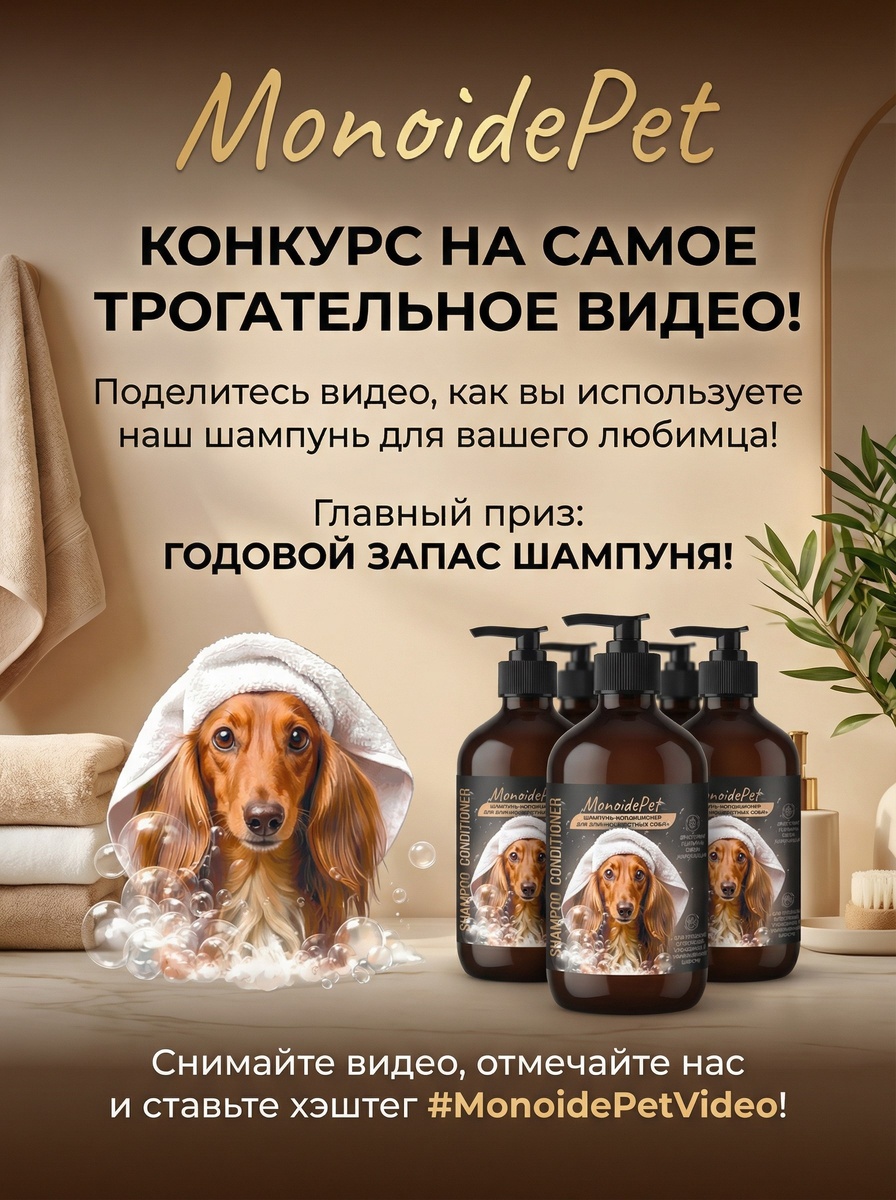 Снимите и опубликуйте во ВКонтакте видео с вашим питомцем, где используется продукция MonoidePet (купание/уход/до–после/трогательный момент).