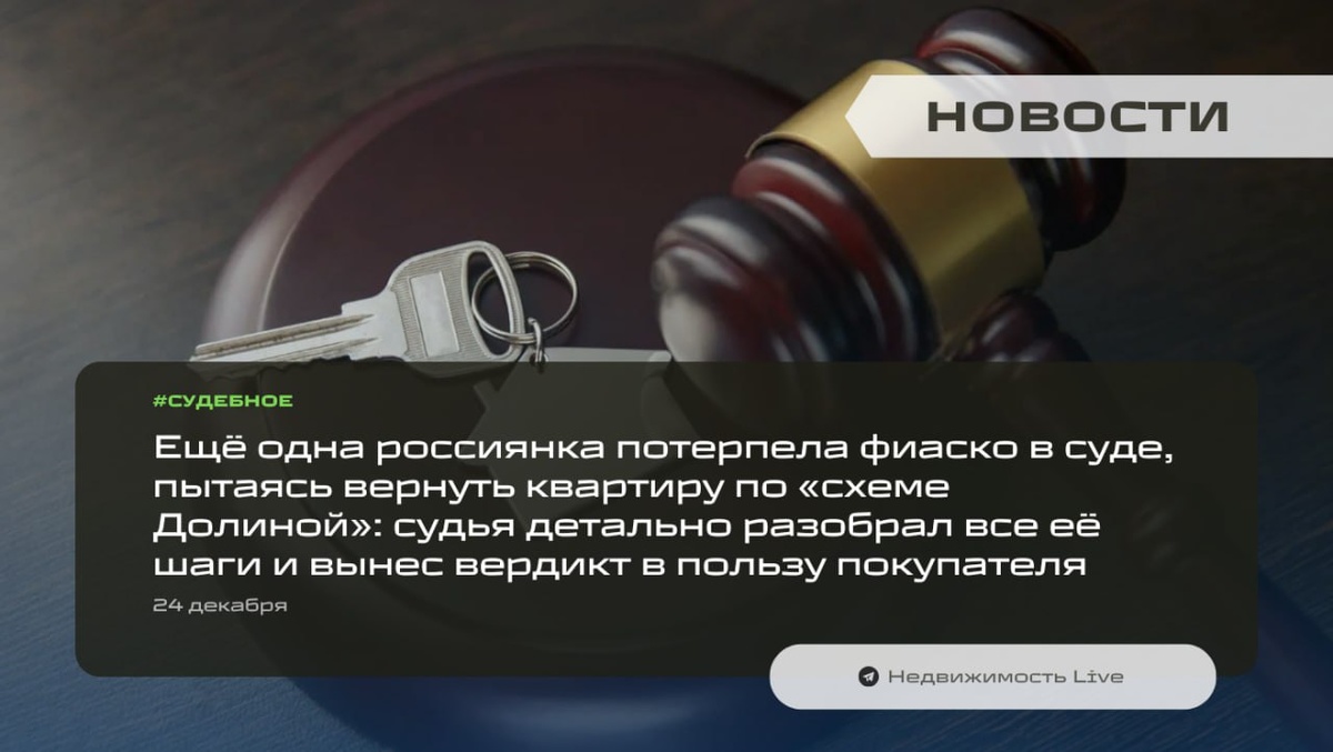 ⚡️ Ещё одна россиянка потерпела фиаско в суде, пытаясь вернуть квартиру по «схеме Долиной»: судья детально разобрал все её шаги и вынес вердикт в пользу покупателя. Красногвардейский районный суд Санкт-Петербурга отказал Татьяне Зайченко в иске о признании недействительной сделки купли-продажи квартиры за 7 млн рублей и постановил выселить её из жилья, взыскав в пользу законной владелицы 300 тысяч рублей задолженности.