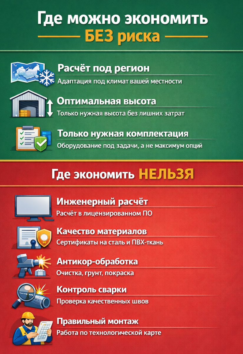 Цена ангара почти всегда кажется понятной — до тех пор, пока за неё не приходится платить второй раз. Вопрос стоимости — один из самых частых при планировании строительства склада, производственного или спортивного объекта. На первый взгляд кажется, что стоимость определяется площадью и ценой за квадратный метр. На практике это ошибка, которая часто приводит к переплатам или проблемам в эксплуатации. В первой статье мы рассказали, почему погоня за низкой ценой часто оборачивается проблемами. Во второй — показали реальные ошибки «дешёвых» ангаров на объекте. Теперь разберём, из чего на самом деле формируется цена тентового ангара, где возможна разумная оптимизация бюджета и в каких местах экономия недопустима. 1. Тип конструкции (B, C или Д) — форма, несущая способность и внутренний объём. Ранее мы уже подробно разбирали, чем отличаются типы конструкций B, C и Д и в каких задачах каждый из них оправдан. 2. Тип ПВХ-ткани и плотность — от этого зависит срок службы и устойчивость к климату