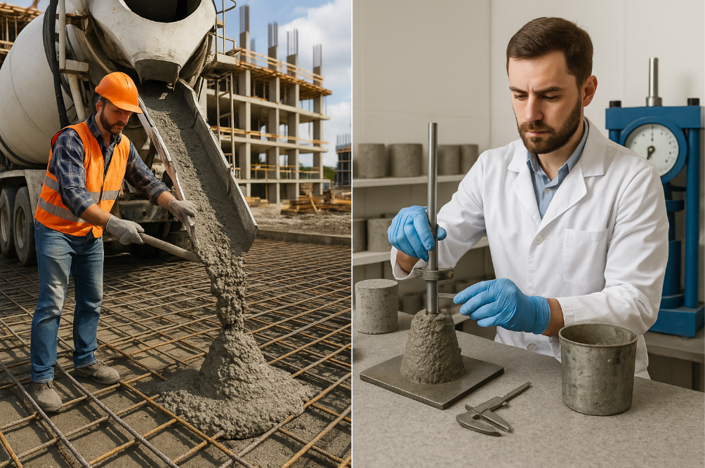Как проверить бетон на качество перед заливкой, если нет лаборатории? Можно косвенно оценить его подвижность. Стандартный тест на осадку конуса проводят так: металлический конус заполняют смесью в три слоя, уплотняя каждый слой. Затем конус поднимают и измеряют, насколько "осела" бетонная горка. В лабораторных условиях это делается с точностью до миллиметра. На объекте можно оценить текучесть смеси визуально - она не должна быть ни слишком густой, ни слишком жидкой.