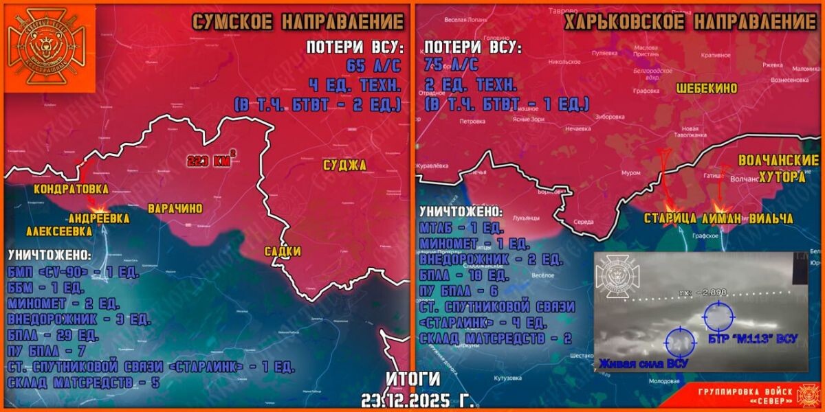К утру 24 декабря группировка войск «Север» продвинулась на десяти участках севернее украинских Сум. Противник безуспешно восстанавливает логистику, ищет резервы для удержания позиций. Так, серьезные проблемы ВСУ на Курско-Сумском фронте испытывает с логистикой. Фактически отрезанными от снабжения оказались позиции 13 батальона 95 одшбр, который лишился последнего тяжелого дрона-курьера. На Теткинском и Глушковском направлениях не зафиксировано кардинальных перемен. Авиация наносила удары по позициям ВСУ в районе Волфино.
