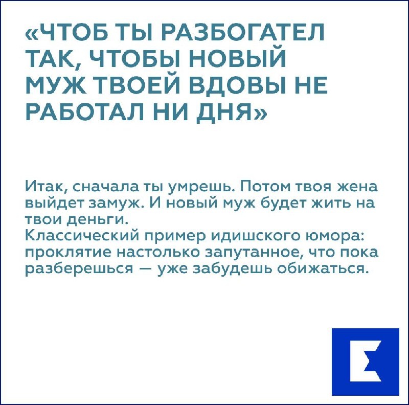 На протяжении веков у евреев не было ни армий, ни власти. Наше имущество могли отнять в любой момент, жизни — тоже. Но у нас оставались слова и мы превратили их в искусство. Идиш — смесь немецкого, разных славянских языков, иврита - язык, где юмор смешан с болью, а проклятия настолько изобретательны, что заставляют смеяться сквозь слезы.