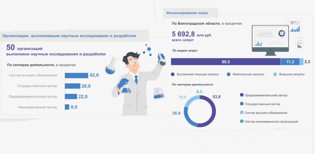 По информации Волгоградстата в Волгоградской области в течение 9 месяцев 2025 года научными исследованиями и разработками занимались 50 организаций, из которых 42,0% относились к сектору высшего образования. Среднесписочная численность работников организаций, выполнявших научные исследования и разработки, составила 3,3 тыс. человек, из них исследователей – 1,8 тыс. человек. Затраты на научные исследования и разработки в январе-сентябре 2025 года по сравнению с соответствующим периодом 2024 года увеличились на 10,1% и составили 5692,8 млн рублей. В структуре затрат на научные исследования и разработки: ➖ 86,5% – на внутренние текущие затраты, ➖ 11,2% – на капитальные затраты, ➖ 2,3% – на внешние затраты. Доля средств федерального бюджета в общих затратах на развитие науки составила 45,6%. 🏛 Подписаться!